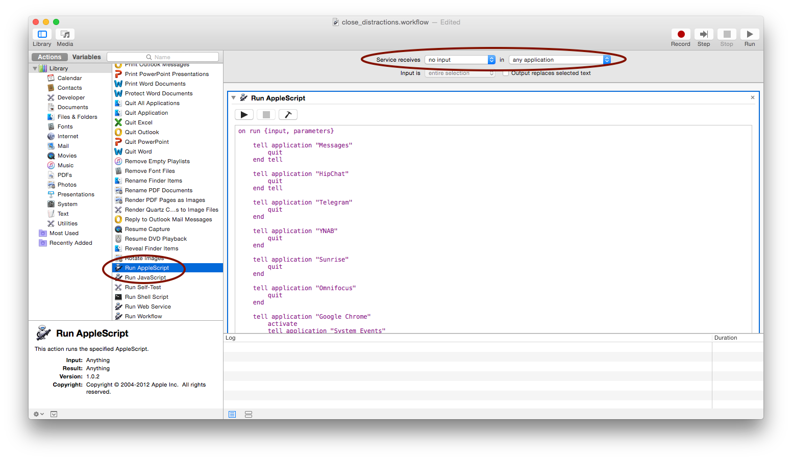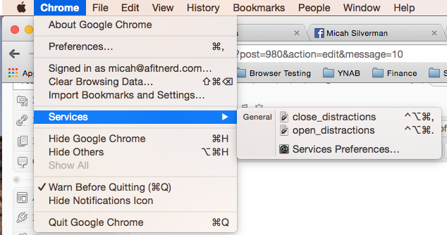 CTRL+ALT+CMD+.Let’s take a look at the “open distractions” workflow code. Again, some of this is very specific to my setup. YMMV.