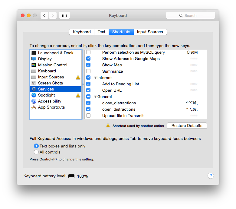 Having these workflows available in any application is critical to being able to being able to trigger them by a key sequence. In the Keyboard System Preference pane, there’s a Shortcuts tab. On that tab, you can bind key sequences to variety of types, including Services.
